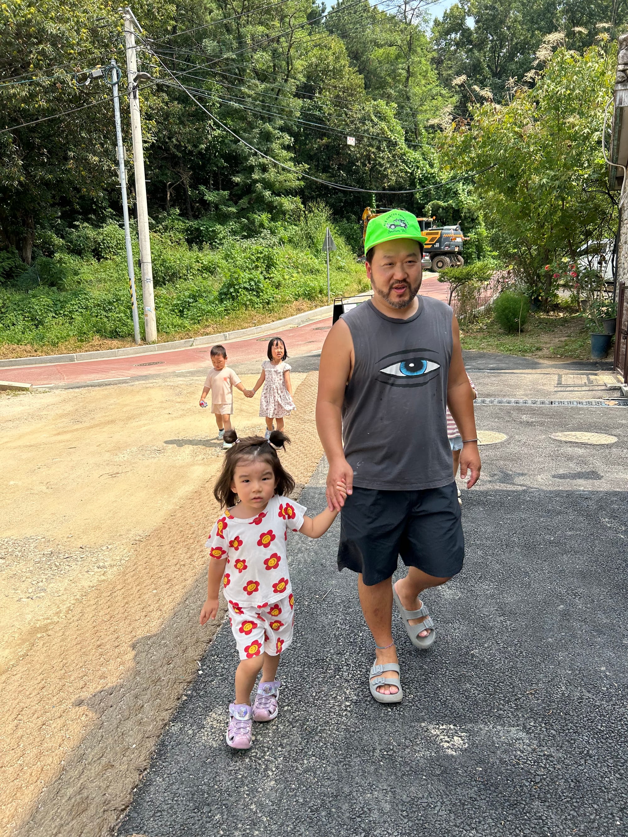 마당에서 돌아오는 길,딸이 내 손을 잡았습니다.