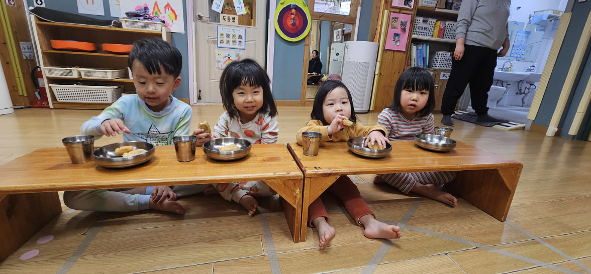 아이들은 햇빛이 들어오는 마당 쪽 밥상에 앉았습니다.