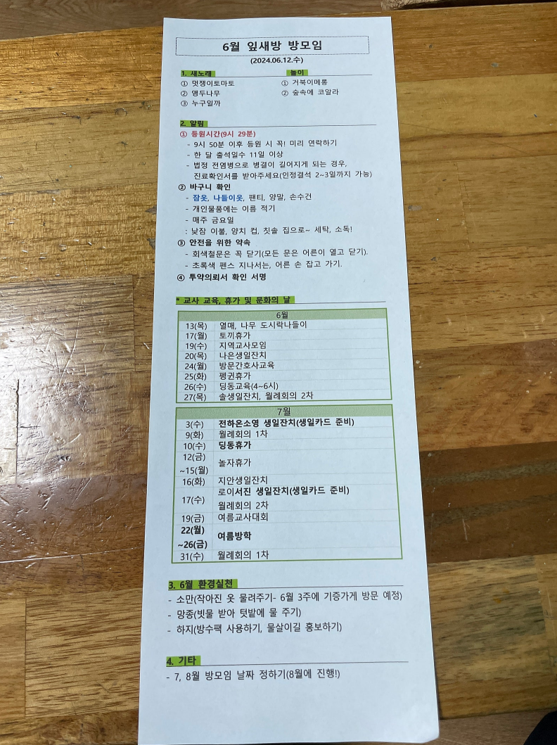 - 아이 근황 토크 → 알림사항 공유 → 안건 논의