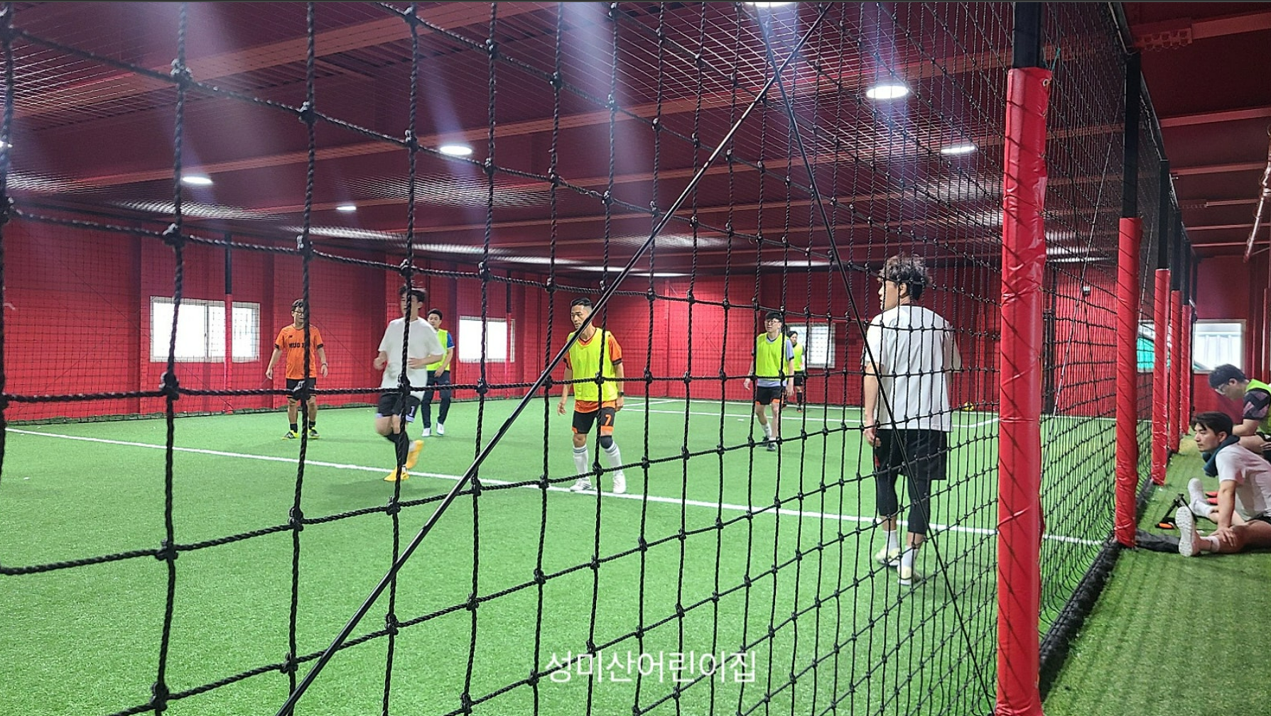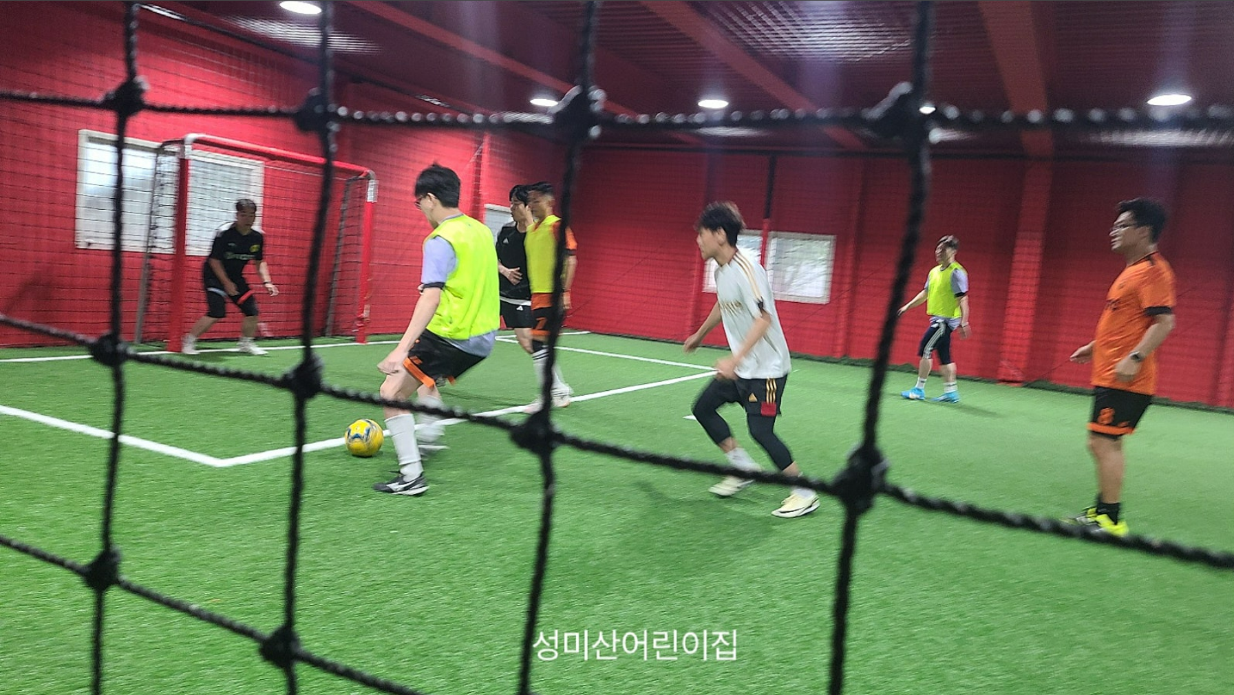 아빠들이 모여 풋살 경기를 즐기며 땀을 흘리고,