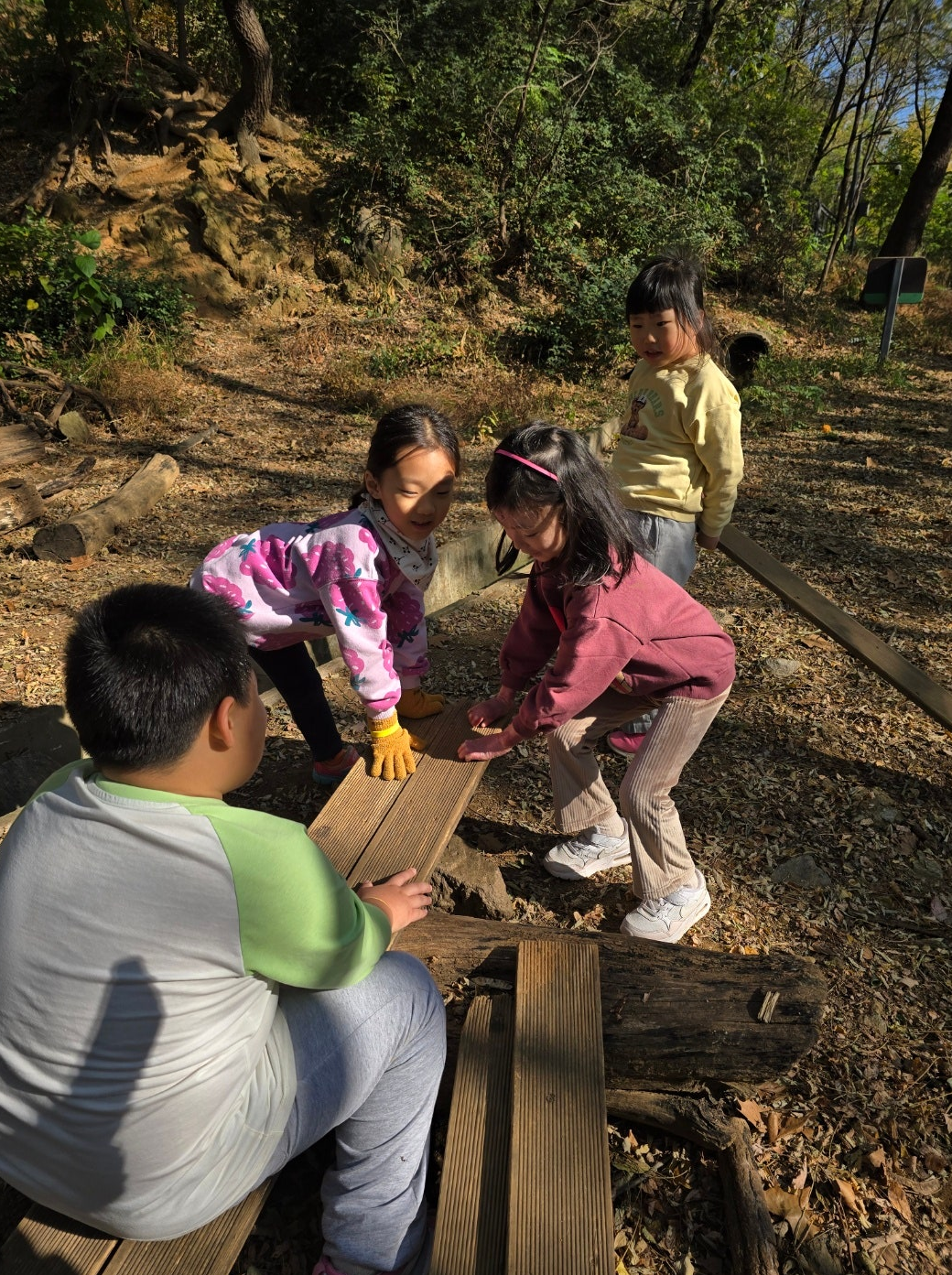 일반적인 어린이집의 야외놀이터에 있는 미끄럼틀이나 운동기구도 아이들이 좋아하지만, 숲에서 경험하는 자연은 그 이상의 특별한 가치를 지닌다고 생각해요. 숲 속에서는 정해진 놀이기구 없이도 아이들 스스로가 놀이를 만들어내고, 상상력을 키울 수 있습니다.
