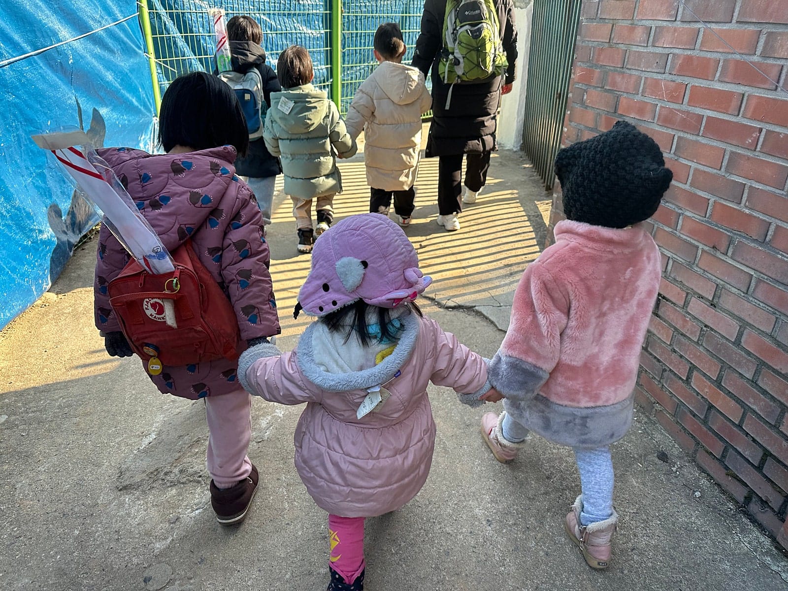 성미산의 '전체 나들이'에서는 7세와 3세가 짝손을 잡고 걷습니다.