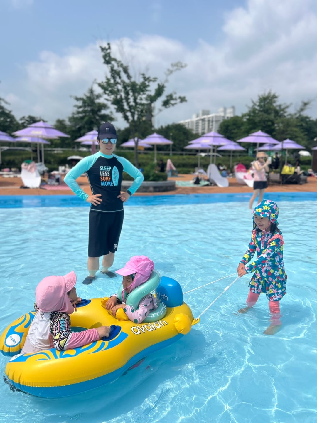 주말이라 사람이 많을 걸 예상하고 오픈런으로 입장, 명당에 파라솔 자리를 잡고 넓은 수영장을 마음껏 누렸답니다.