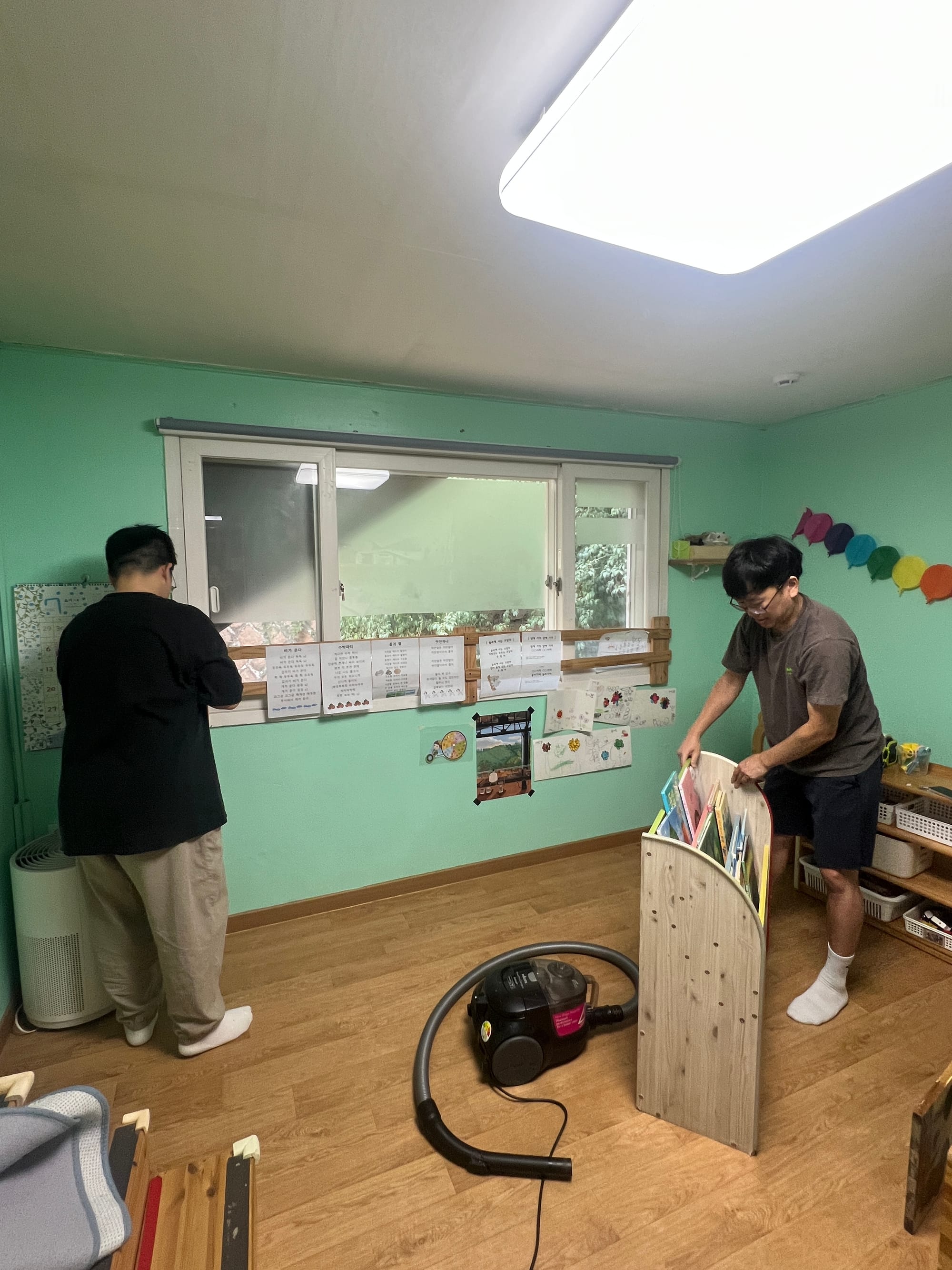아이들이 맨발로 뛰어노는 공간이니만큼 빗자루와 물청소로 구석구석 먼지를 깨끗이 쓸어냈습니다.