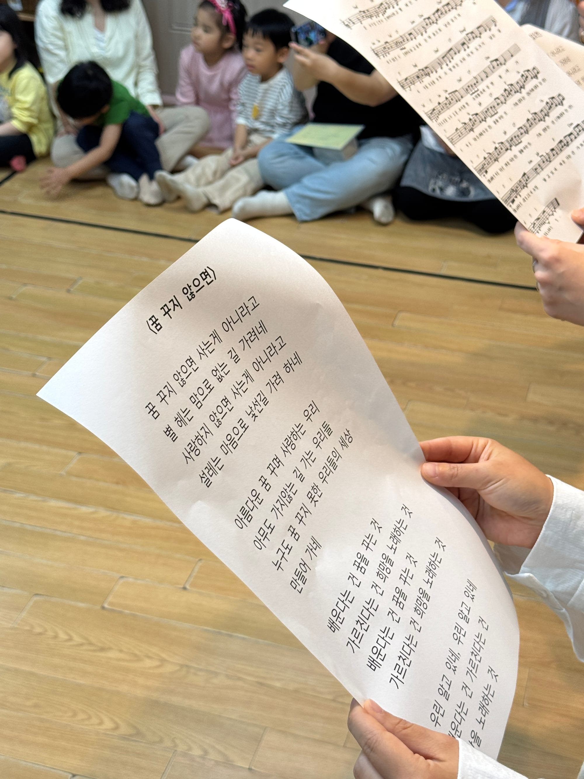 이어진 작은공연에서는 아마(부모님)들이 품을 내어 '꿈꾸지 않은면'를 불렀습니다. 맑은 목소리(그냥 열심히 불렀어요) 손박수와 함께 선생님들은 감동의 눈물을 흘리시고 싶은 신 듯 했어요...(그냥 그렇다고 해주세요)